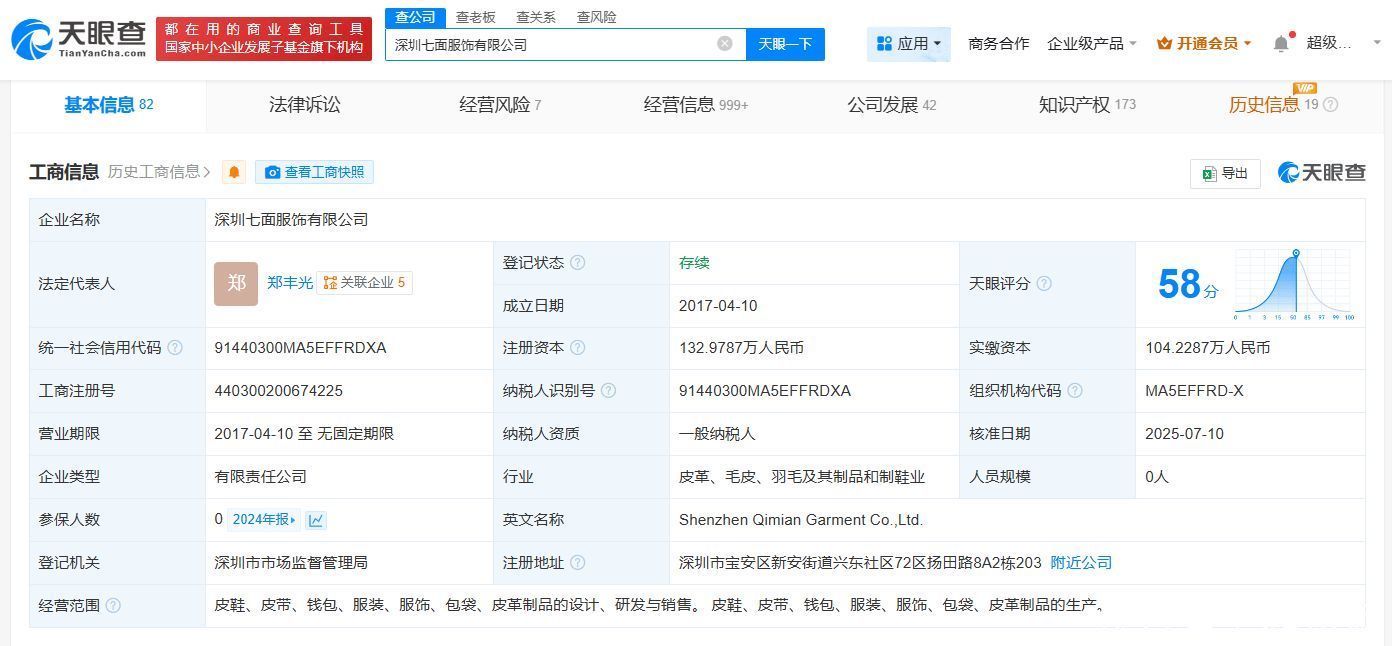 深圳七面服饰有限公司成立于2017年4月,法定代表人为郑丰光,注册资本约132.98万人民币,经营范围包括皮鞋、皮带、钱包、服装、服饰、包袋、皮革制品的设计、研发与销售,现由郑丰光、深圳市七面创投有限合伙企业(有限合伙)、深圳米贝特时尚科技有限公司共同持股。