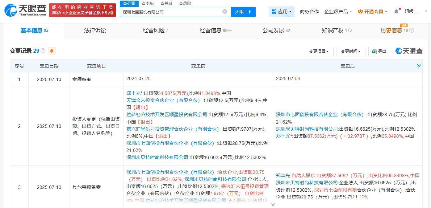 天眼查App显示,近日股票知识网,深圳七面服饰有限公司发生工商变更,小米旗下天津金米投资合伙企业(有限合伙)以及拉萨经济技术开发区顺盈企业管理有限公司、嘉兴汇米伍号投资管理合伙企业(有限合伙)退出股东行列。